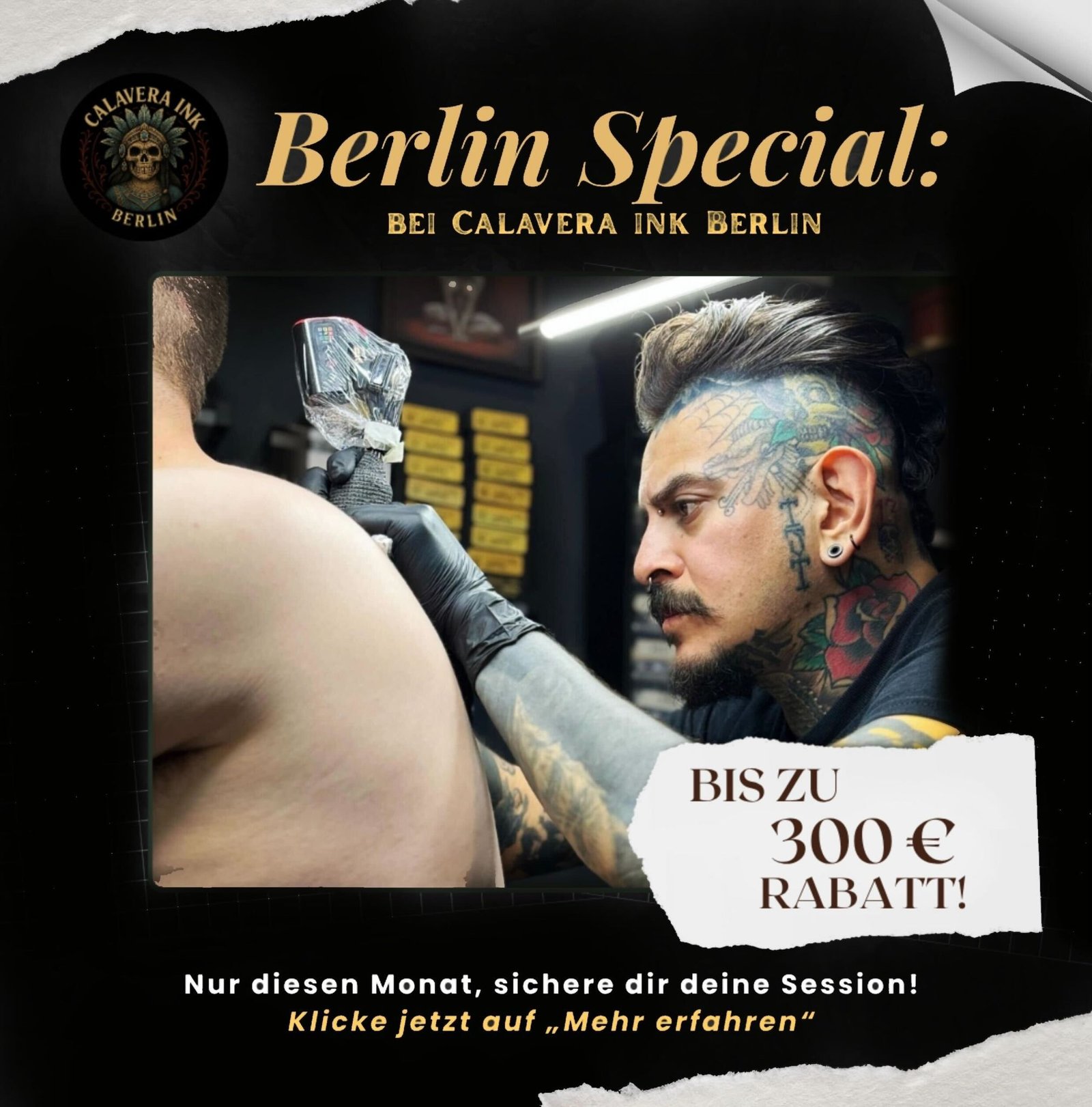 Beginne deine nächste Tattoo-Reise bei Calavera Ink. Entdecke unsere neuesten Arbeiten und sichere dir jetzt deinen 300 €-Gutschein. Einzigartige Designs, erfahrene Künstler und Kunst, die deine Geschichte erzählt.